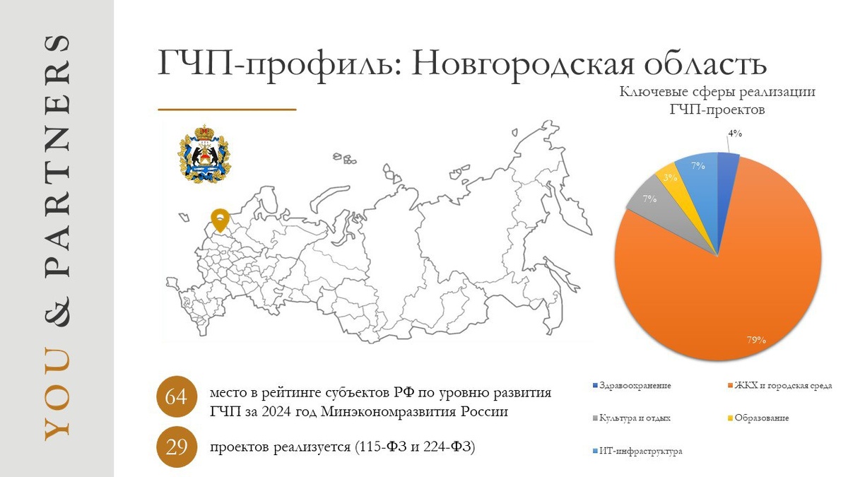 🏆 Место в рейтинге - 64 Согласно итоговой оценке рейтинга субъектов РФ по уровню развития ГЧП за 2024 год (Минэкономразвития России), Новгородская область занимает 64 место, опустившись на 2 позиции по сравнению с 2023 годом). Наиболее интересные проекты, планируемые к реализации на территории Новгородской области: 🌳 Исторический парк семейного отдыха в Новгородском районе; 🎠 Детский развлекательный центр в Боровичском районе. 🧮 Количество проектов: По данным мониторинга проектов в сфере ГЧП Минэкономразвития России (https://www.economy.gov.ru/material/departments/d22/gosudarstvenno_chastnoe_partnerstvo/monitoring_proektov_v_sfere_gchp/) в регионе реализуются 29 ГЧП-проектов (учтены проекты по 115-ФЗ и 224-ФЗ на стадиях от предынвестиционного этапа до завершения проекта). 🧩 Сферы реализации проектов: Проекты реализуются в следующих сферах: - культура и отдых (2 проекта); - ЖКХ и городская среда (23 проекта); - образование (1 проект); - ИТ-инфраструктура (2 проекта); - здравоохран