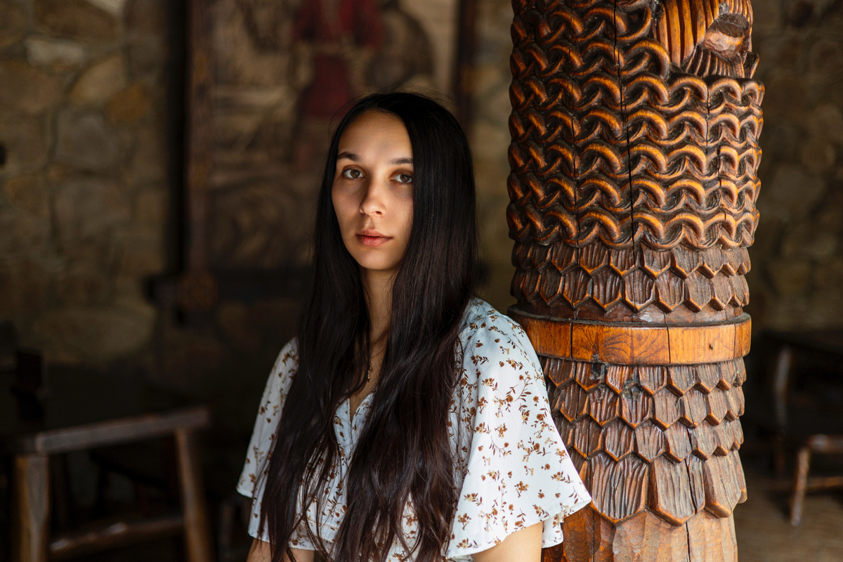 Иногда для хорошего портрета не нужны сложные декорации и студийный свет. Достаточно одной интересной детали в пространстве, удачного света и человека, который в этот момент позволяет себе просто быть собой. Этот кадр снят в парке Лога — месте, которое многие знают по масштабным ландшафтам, скульптурам и туристической суете. Но если немного притормозить и отойти в сторону от основных маршрутов, парк открывается совсем по‑другому: становится тише, камернее и гораздо более «живым» для съёмки. В этой локации внимание сразу привлекла резная деревянная колонна. Фактура дерева, тёплые оттенки и мягкий боковой свет создали идеальное окружение для спокойного, чуть задумчивого портрета. Модель стоит почти вплотную к колонне, но при этом не «теряется» в пространстве: свет мягко выделяет лицо, а фон уходит в приятное размытие. Такая подача помогает сосредоточиться на взгляде и настроении, а не только на внешней красоте локации. В парке Лога много точек притяжения, и порой хочется унести с собой к