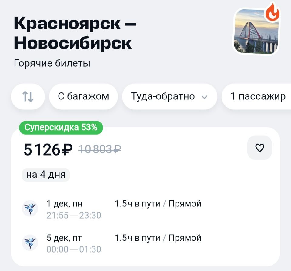Если вам вдруг внезапно захотелось в Новосибирск, то у Нордстара на сегодняшний вечер есть такой вариант: https://aviasales.tpm.lv/zrwoXfDi #OVB @KJA
