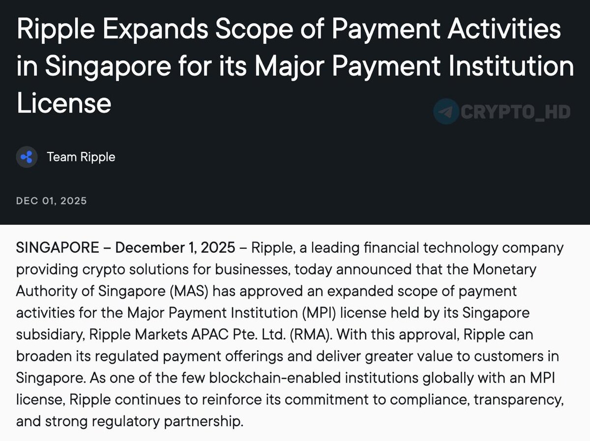 #xrp #rlusd 🇸🇬 Ripple захватывает крипторынок Сингапура. Монетарное управление страны расширило лицензию Major Payment Institution для Ripple, открыв компании доступ к более широкому спектру регулируемых платежных услуг в стране. Детали: • Ripple теперь может развивать полноценную инфраструктуру быстрых и прозрачных трансграничных платежей, используя цифровые платежные токены (DPT) вроде RLUSD и XRP. • Клиентам не нужно строить собственную инфраструктуру – все закрывается одним интегрированным решением Ripple. Ранее: - Абу-Даби - стейкинг в XRP Ledger Crypto Headlines