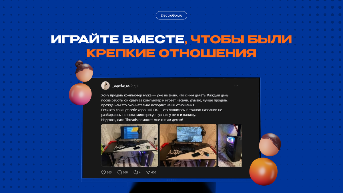 Иногда техника, призванная приносить радость, становится причиной конфликтов. Недавно в сети прогремела поучительная история: Девушка поделилась, что планирует продать компьютер мужа, так как он слишком много играет, и это негативно влияет на их отношения. Однако, комментарии оказались неожиданными: многие начали объяснять, что продажа компьютера — это практически путь к разводу. Некоторые поддержали мужа, утверждая, что в таких отношениях он, возможно, находит единственное место, где может быть самим собой. В конце концов, девушка призналась, что муж благодарен всем, кто его поддержал. Мы в ElectroGor.ru не сторонники радикальных методов. И у нас есть элегантное и экспертное решение, как уберечь ваш брак от подобного кризиса! Почему ПК может стать главной причиной развода Проблема не в играх, а в отсутствии общего интереса и дефиците внимания. Когда один партнер занят увлекательным рейдом, а второй ждет, это неизбежно порождает недовольство. Пытаться запретить досуг, который важен д