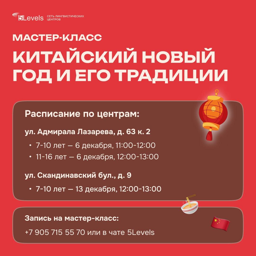 🐉 Мастер-класс Китайский Новый год и его традиции Приглашаем на познавательные и яркие встречи 6 декабря и 13 декабря: расскажем, как празднуют Китайский Новый год, разберём простые фразы по теме и познакомимся с интересными традициями и культурой страны ✨ Расписание на субботу 6 декабря: – 7-10 лет — 11:00-12:00 – 11-16 лет — 12:00-13:00 📍 Адрес: ул. Адмирала Лазарева, д. 63 к. 2 Расписание на субботу 13 декабря: – 7-10 лет — 12:00-13:00 📍 Адрес: Скандинавский бульвар, д.9 Вход свободный по предварительной записи. 📲 Записаться и задать вопросы можно по телефону: +7 905 715 55 70 или в чате 5Levels.