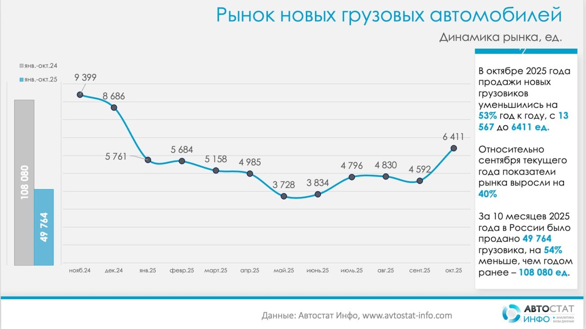 Региональный разлом на рынке новых грузовиков По данным «Автостат Инфо», российский рынок новых грузовых автомобилей в октябре 2025 года оставался в фазе глубокого спада, хотя отдельные месяцы и регионы начинают показывать признаки оживления. В октябре 2025 года было продано 6 411 новых грузовиков, то есть вдвое меньше, чем год назад, когда рынок достигал отметки в 13 567 машин (- 53% год к году). При этом к сентябрю текущего года зафиксирован заметный прирост показателей: тогда было 4 592 автомобиля, а октябрьский результат оказался выше на 40%. То есть локальная деловая активность восстанавливается, но на общем фоне почти двукратного сжатия за год это лишь частичная компенсация. С января по октябрь 2025 года в стране реализовано 49 764 новых грузовика против 108 080 годом ранее. Сжатие рынка за период достигло 54%. Таким образом, он вернулся к масштабам примерно половины прошлогоднего уровня. Линия помесячной динамики подтверждает эту картину: после относительно высоких значений