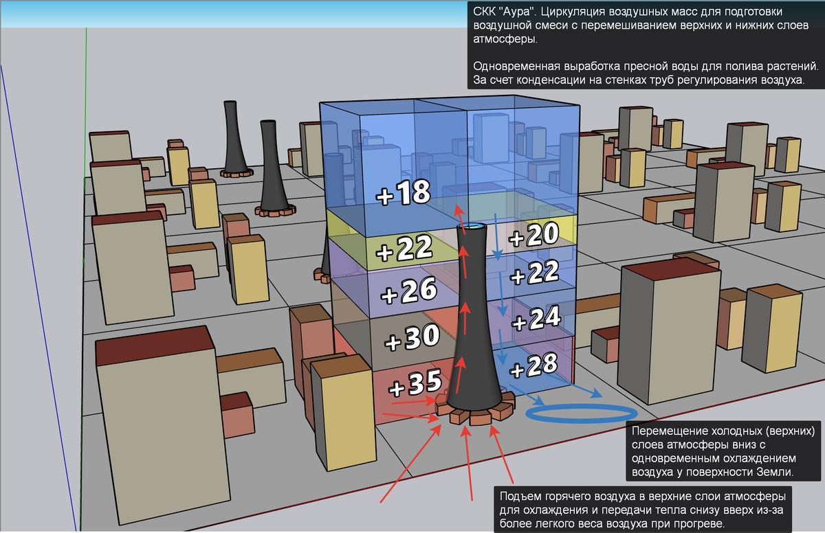 - Лечение мегаполисов: Система сможет постоянно «проветривать» города, вытягивая смог и заменяя его чистым воздухом, а также создавая комфортный температурный режим.