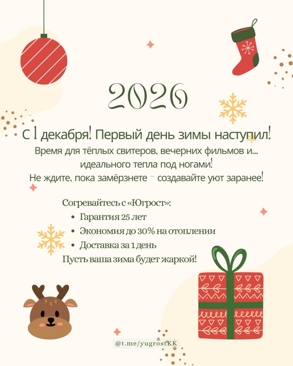 ❄️ С первым днём зимы, друзья! Пусть этот день станет началом чего-то волшебного: • Вечеров под пледом с чашкой какао • Долгих разговоров при мягком свете лампы • Уютной атмосферы, когда за окном метель, а у вас дома — тепло и комфорт Желаем вам тёплых встреч, горячих напитков и самых уютных моментов этой зимой! Пусть в вашем доме всегда будет та самая «правильная» температура — и для души, и для ног 😉 С любовью, ваша команда «Югрост» ❤️🔥