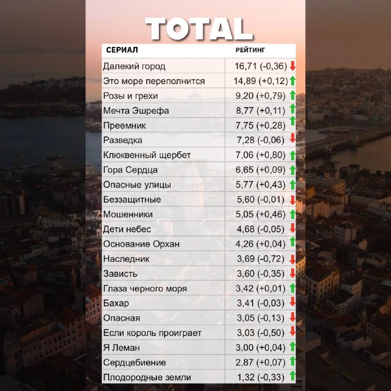 В период с 24 по 30 ноября турецкие сериалы продолжили борьбу за внимание зрителей, демонстрируя как стабильные успехи, так и неожиданные повороты. Анализ рейтингов показывает, что некоторые проекты укрепили свои позиции, в то время как другие столкнулись с трудностями. Давайте разберёмся в деталях на основе данных по категориям AB, ABC1 и Total. Сериал "Это море переполнится" продолжает уверенно расти и на этой неделе не только удерживает первое место в категории AB, но и впервые выходит на вершину в ABC1. Этот успех подчёркивает растущую популярность проекта среди более широкой аудитории. "Далекий город" остаётся на первом месте в категории Total, однако на прошлой неделе наблюдалось небольшое падение во всех категориях. Несмотря на динамичный сюжет, сериалу есть над чем задуматься, чтобы сохранить лидирующие позиции. "Розы и грехи" впервые ворвался в топ-3 в категории Total! После колебаний в предыдущие недели сериал заслуженно занял почётное место благодаря качественному повество