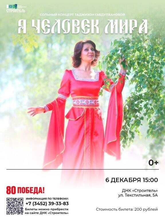 Сольный концерт Таджихон Габдулхановой — «Я человек мира» ⏳ Когда: 6 декабря в 15:00 🔎 Где: ул. Текстильная, 5А 📌 Стоимость: 200 рублей 0+ ✨ Сольный концерт Таджихон Габдулхановой «Я человек мира» ✨ 6 декабря в 15:00 во Дворце национальных культур «Строитель» состоится особенное событие — сольный концерт лауреата Всероссийского конкурса «Димитриевская суббота» и обладательницы Гран-при международных фестивалей и конкурсов Таджихон Габдулхановой. Музыка не знает границ — она способна объединять людей разных национальностей и культур. В программе прозвучат яркие и проникновенные вокальные композиции на русском, узбекском, турецком, таджикском, индийском и арабском языках. Каждый номер — это путешествие в атмосферу другой страны, её мелодий и эмоций. Украсят концерт яркие хореографические коллективы, добавив действию красок, ритма и энергии. Погрузитесь в атмосферу гармонии, вдохновения и единства — почувствуйте, как искусство объединяет нас всех в одно большое мировое сердце. Би