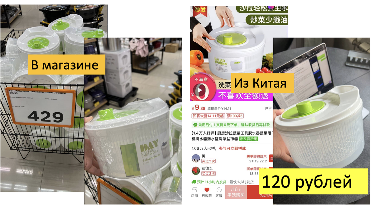 Зашла сегодня в магазин с товарами для дома, просто посмотреть. И наткнулась на ту самую центрифугу для сушки овощей и зелени. Пластмассовая, зеленая, с ручкой. Точно такая же, как та что я заказала из Китая на Пиндуодуо Обошлась мне в 9,88 юаня — это 120 рублей, В магазине ценник 429 рублей. На маркетплейсах наших глянула — от 390 руб. Решила посчитать сколько я сэкономила Доставка заказа в общем вышла 461 юань за 9 кг. А позиций в заказе было 33. Я всегда для себя считаю просто: делю стоимость доставки на количество вещей. Не заморачиваюсь с точным весом каждой, мне так нагляднее. Получается, на каждую позицию пришлось по 13,9 юаня (это 185₽). Так вот, моя центрифуга: 120₽ (товар) + 185₽ (доставка) = 287 рублей. Выгода: 429 - 287 = 142 рубля. Не то чтобы космическая, да? Ну, на кофе. Но вся соль не в ней одной! Весь заказ — это 33 позиции. Если грубо прикинуть, что по 150 рублей с каждой вещи мы сэкономили, то уже выходит почти 5000 рублей. Но если копнуть чуть глубже, картина весе