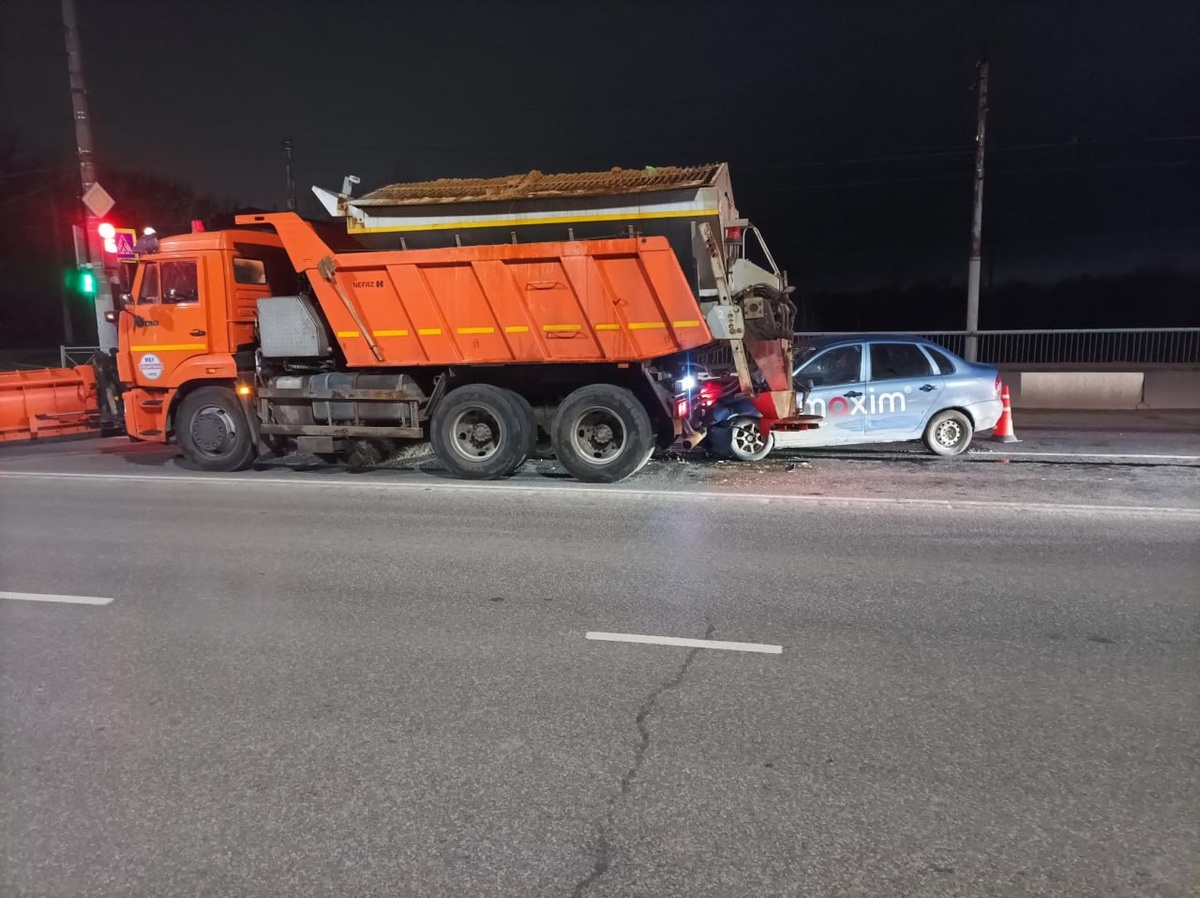 Сегодня ночью в Орле такси и КАМАЗ не разъехались на попутной дороге. ДТП произошло в 01:05 на Кромском шоссе в районе дома №29. Согласно сводке орловской ГАИ, водитель на «Ладе Калине» не выдержал безопасную дистанцию и «догнал» пескоразбрасыватель «Спецавтобазы». Водитель легковушки травмирован. Его доставили в областную больницу, понадобилась госпитализация. На месте ДТП вместе с медиками, автоинспекторами работали и пожарные. Они смыли топливо с проезжей части. (Фото: Орловской Госавтоинспекции и орловской ГУ МЧС) @1oblastnoi