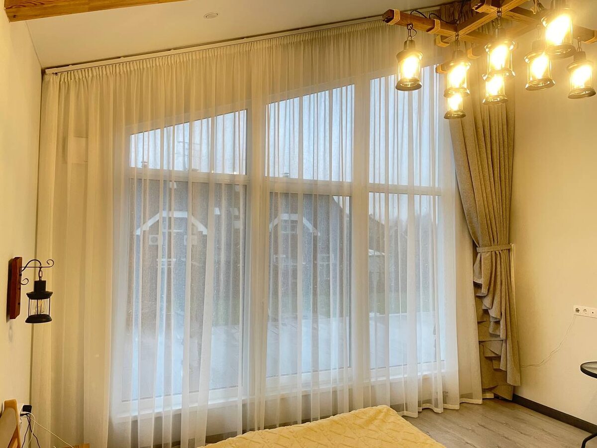 На этом объекте мы не только изготовили идеальные электрокарнизы под сложный угол, но и пошили шторы, которые легки безупречно.