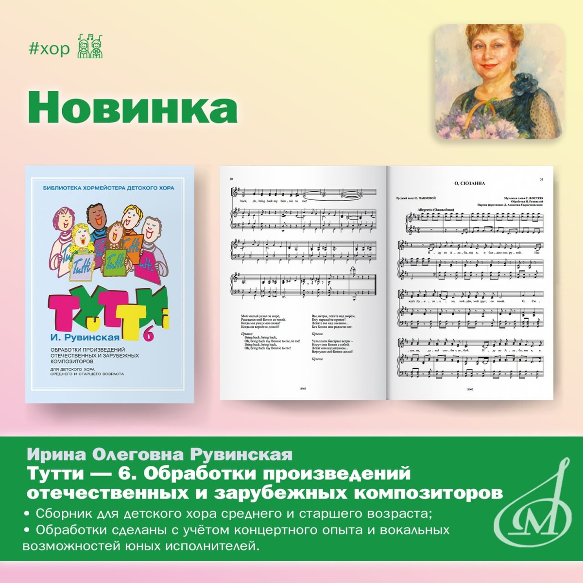 🎶 Новинка: «Тутти–6». И. Рувинская. Обработки произведений отечественных и зарубежных композиторов для детского хора Рассказываем про новый сборник хоровой серии от издательства «Музыка» — «Тутти» . «Пой усердно в хоре, особенно средние голоса. Это сделает из тебя хорошего музыканта», — писал Роберт Шуман в «Жизненных правилах для музыкантов». Следуя этому наставлению, мы постоянно расширяем хоровой репертуар для юношества. ⏺Каждый сборник серии «Тутти» предлагает самые разнообразные произведения для детского хора. В шестой выпуск вошли песни таких советских композиторов, как Н. Потоловский, В. Вавилов, а также «Осенняя песня» Ф. Мендельсона, «О, Сюзанна» С. Фостера, одна из шотландских народных песен и другие мелодии. Кроме навыка хорового пения, они также могут расширить музыкальный кругозор юных хористов. К слову, музыку к ряду песен сочинила и сама автор сборника Ирина Рувинская — хормейстер, почётный работник культуры города Москвы, педагог Московской ДМШ имени В. И. Мурадели,