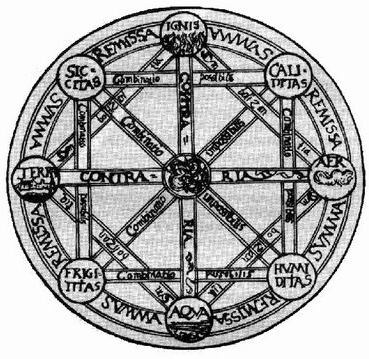 · Греческую натурфилософию: Учение Аристотеля о четырех элементах (Огонь, Вода, Воздух, Земля) и четырех качествах (тепло, холод, сухость, влажность). Трансмутация объяснялась изменением баланса этих качеств.