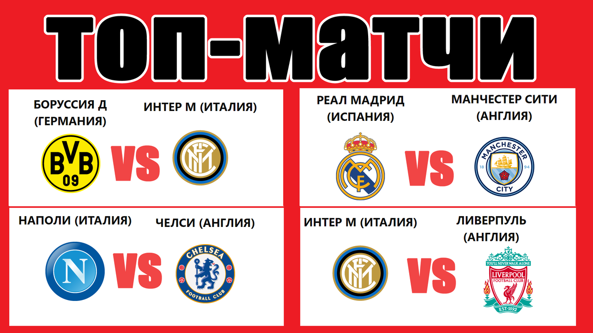 Бавария - Спортинг (9 декабря, 20:45) Интер - Ливерпуль (9 декабря, 23:00) Реал - Манчестер Сити (10 декабря (23:00). Интер - Арсенал (20 января, 23:00) Боруссия Д - Интер (28 января, 23:00) Наполи - Челси (28 января, 23:00) Ставьте класс, если выпуск был полезен. До встречи на "спортивном".