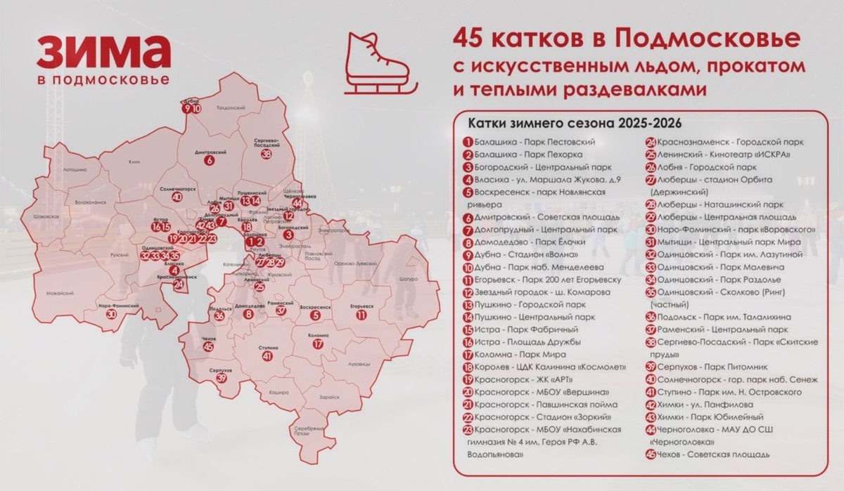 Адреса 45 катков в Подмосковье с искусственным льдом и прокатом Источник: Открыть