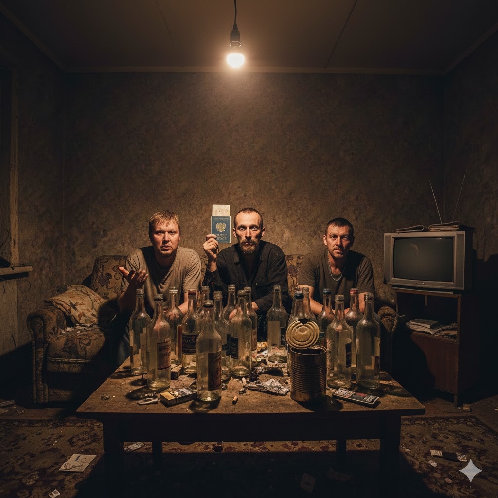 К тому моменту мы уже третьи сутки существовали в режиме автономного запоя. Степень деградации достигла той фазы, когда даже самые базовые социальные обязательства казались невыносимым бременем. Все деньги, все лимиты, все резервы были истощены. У двоих из нашей компании под залог в ларьке лежали даже паспорта, «ксивы», без которых мы чувствовали себя как без кожи. Помню, как сидел на обшарпанном диване в съемной двушке, и тусклый свет разбитой лампочки падал на стол, уставленный пустыми бутылками, обёртками от дешевых сигарет и какой-то несчастной консервной банкой, которая, очевидно, была последней жертвой нашего пира. В воздухе висел стойкий, неистребимый запах перегара, дешёвого табака и безнадёжности. Мы были на самом дне колодца.