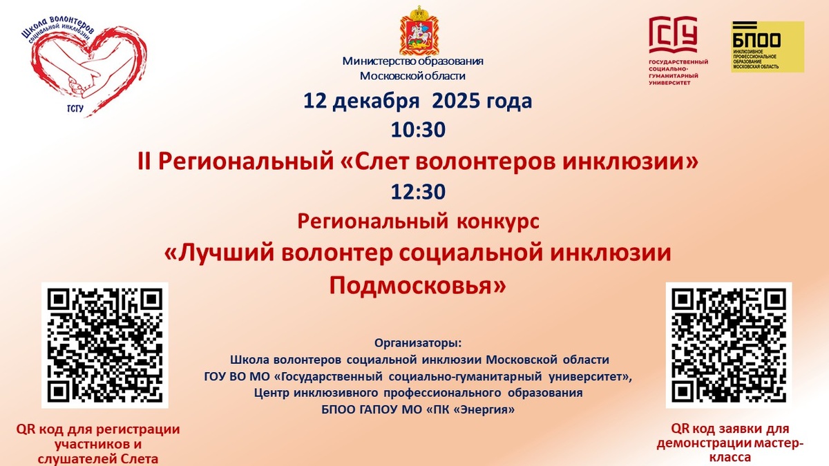 Внимание, волонтеры инклюзии! Приглашаем на II Региональный слет волонтеров инклюзии Московской области! Школа волонтеров социальной инклюзии Московской области информирует о проведении II Регионального Слета волонтеров инклюзии, направленного на развитие волонтерской деятельности и ознакомление студенческой молодёжи с лучшими практиками в области социальной инклюзии! ️🌟 Что вас ждет? ✔ Обмен опытом и знакомство с передовыми практиками инклюзивного волонтерства. ✔ Участие в региональном конкурсе "Лучший волонтер социальной инклюзии Подмосковья". 📅 Ключевые даты: