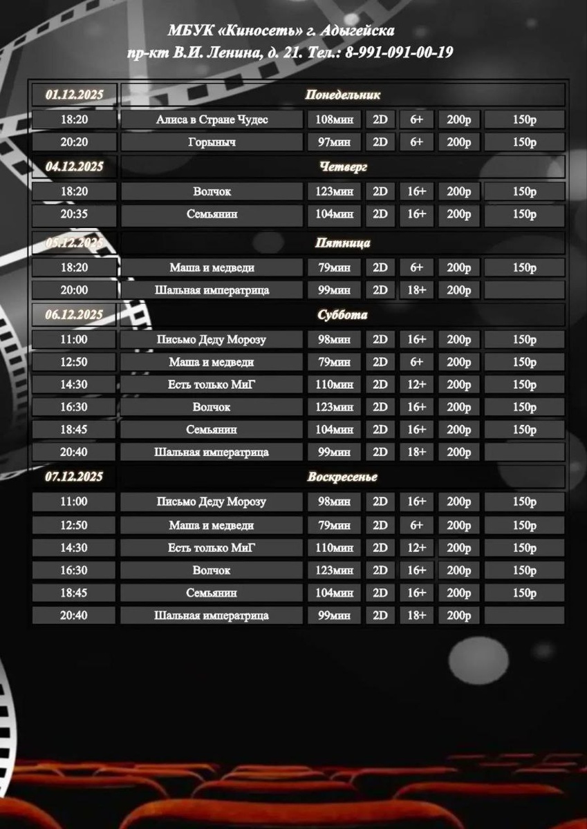 Расписание Кинозала г. Адыгейска с 01.12.2025 по 07.12.2025🎞 Купить билет онлайн можно по ссылке внизу 👇https://clck.ru/32VTgE ___ Мы в социальных сетях👇 VK 🎞https://clck.ru/34TuU5 TG 🎞https://clck.ru/34TuU6 ОК 🎞https://clck.ru/3MdGRj 🎞WhatsApp: 8-991-091-00-19 📱8-991-091-00-19