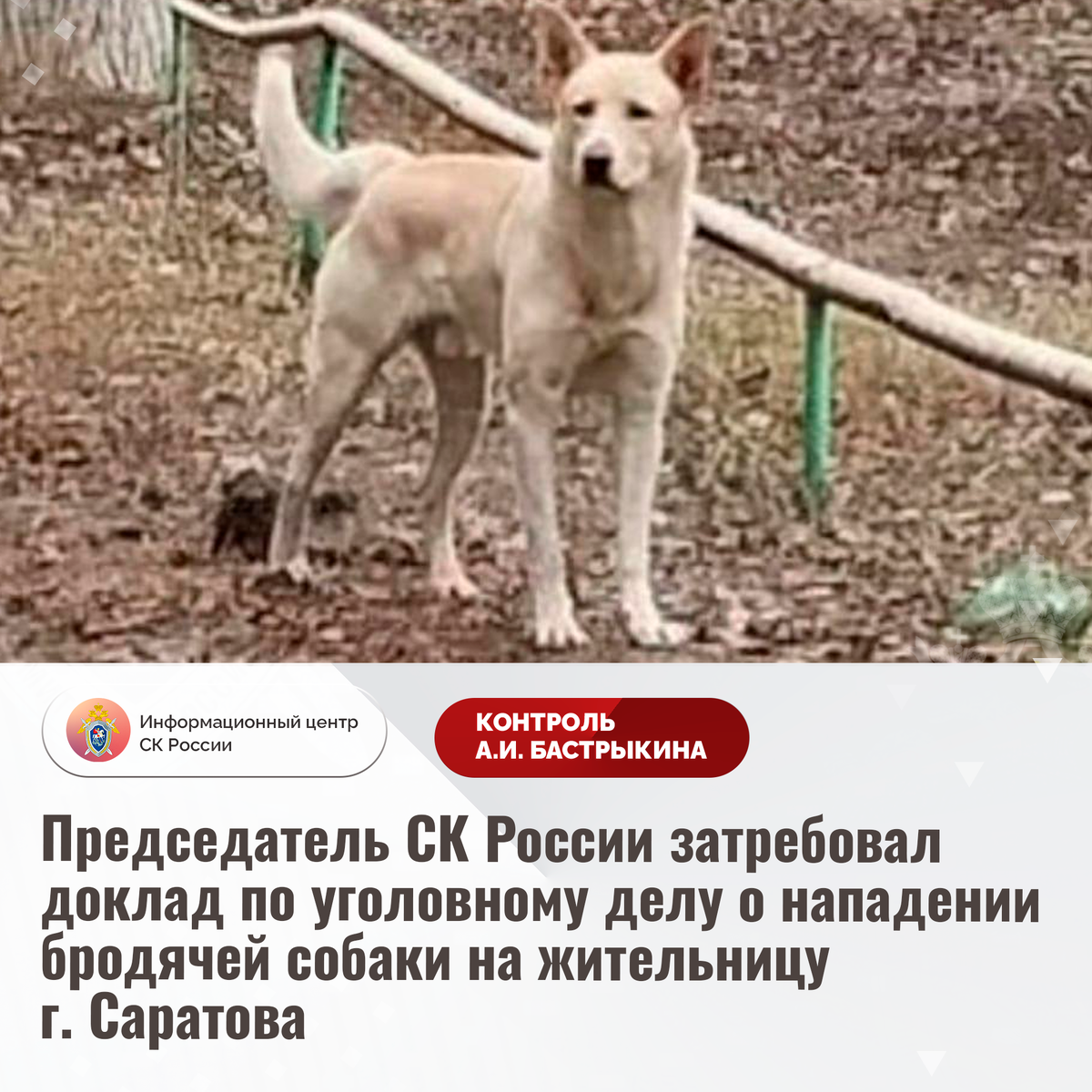 Председатель СК России затребовал доклад по уголовному делу о нападении бродячей собаки на жительницу г. Саратова В социальной сети сообщается, что в ноябре текущего года в городе Саратове безнадзорная собака напала на местную жительницу. Пострадавшей потребовалась медицинская помощь. Отмечается, что ранее агрессивное животное нападало на других граждан. Несмотря на многочисленные обращения в компетентные органы, до настоящего времени мер к отлову не принято. В СУ СК России по Саратовской области возбуждено уголовное дело. Председатель Следственного комитета Российской Федерации Александр Иванович Бастрыкин затребовал у руководителя СУ СК России по Саратовской области Дмитрия Александровича Костина доклад о ходе и результатах расследования уголовного дела. Исполнение поручения поставлено на контроль в центральном аппарате ведомства. #СледственныйКомитет #СКРоссии #СКР #ИЦСКР #ИнформационныйЦентр #АлександрБастрыкин #ПредседательСКР #КонтрольПредседателяСКР #КомментарийКонтроль #Сарато