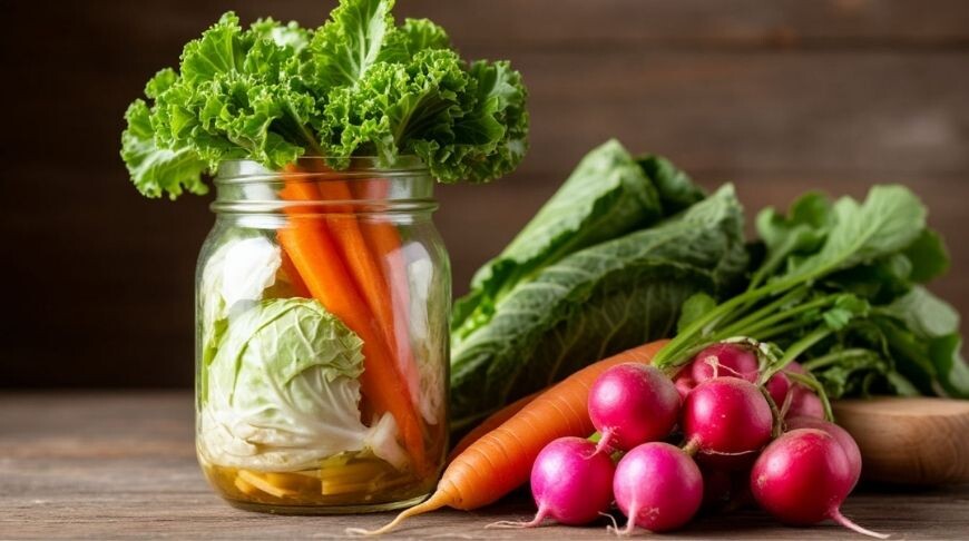 Ферментирование - один из эффективных способов сохранить овощи с пользой для здоровья. Делимся рецептом! Ингредиенты: Для рассола: Приготовление Для сохранения максимального хруста капусту нарезают крупными кусками. Редьку и морковь режут тонкими кольцами. Чеснок придает пикантность, а брокколи - легкую приятную горчинку. Овощи укладывают слоями в чистую стеклянную банку. На дно кладут лавровый лист и перец для аромата, затем идут следующие слои: капуста, редиска, морковь, чеснок и брокколи. По желанию сверху можно добавить зелень и семена горчицы. Соль растворяют в воде, чтобы получился рассол, которым заливают овощи так, чтобы они были полностью покрыты. Ферментация и хранение Банку накрывают крышкой неплотно или марлей, чтобы газы могли выходить. Овощи оставляют при комнатной температуре 20–24 °C на три–пять дней. Ежедневно проверяют наличие пены и при появлении снимают ее. После ферментации овощи становятся кисловатыми, а рассол мутнеет - это нормальные признаки успешного брожения.