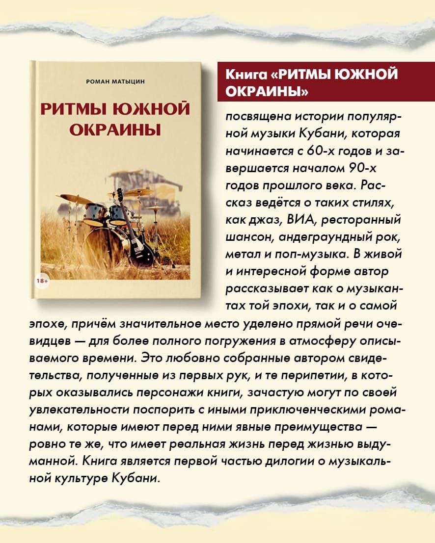 👋Друзья! 🎅 Представляем вам собранные информационные материалы, посвященные музыкальной культуре Кубани, под названием "Ритмы южной окраины". Автор книги исследует период от 60-х и до начала 90-х гг. Где в основном предоставлены и описаны в легкой, интересной форме, исторические факты о рок-группах, о джазменах , о ВИА, а также о ресторанном шансоне, поп-музыке, андеграундном роке существовавших в тот период времени на Кубани. О музыкальной жизни Юга России, судя по всему, многим южанам известно не так много, что уж говорить о профессионалах в обеих столицах....... "Ритмы южной окраины" заполняет этот информационный вакуум и создает уникальную возможность погрузиться в эпоху рождения и развития региональной сцены. ...... музыкальный журналист: Артем Липатов. Книга представлена в твердой обложке, имеет 350 страниц, включая фото, блок цветных иллюстраций и описание. Для любителей музыки, а также для тех кому интересно погрузиться в историю и больше узнать об самой эпохе и