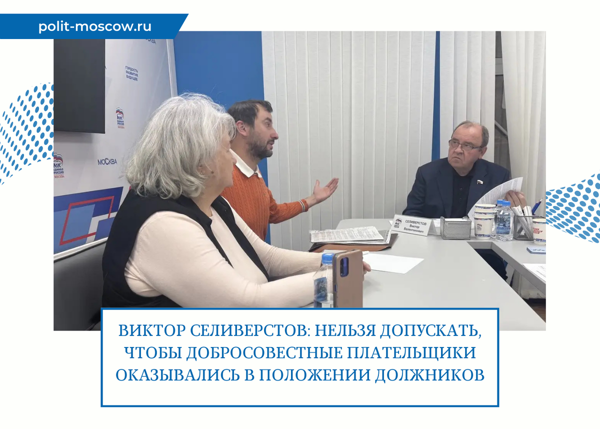 Семья пенсионеров из района Вешняки города Москвы пожаловалась заместителю руководителя фракции «Единая Россия» в ГД Виктору Селиверстову на проблему с оплатой услуг ЖКХ. Им уже несколько месяцев в квитанции приходит задолженность за электричество, которую они давно оплатили. Компания – поставщик электроэнергии подтверждает им, что долгов нет, но квитанции исправно приходят. Более того, из-за того, что квитанция общая с оплатой других коммунальных услуг, они не могут платить за квартиру.