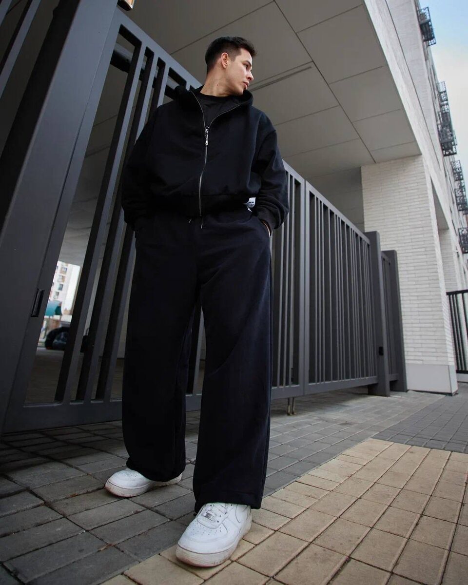 Мужские черные базовые костюмы с худи и зип- худи 100% хлопок пич эффект ( бархат) С начесом худи Зип- Худи без начеса, но материал очень плотный Сайт: https://maridenizdesign.com/