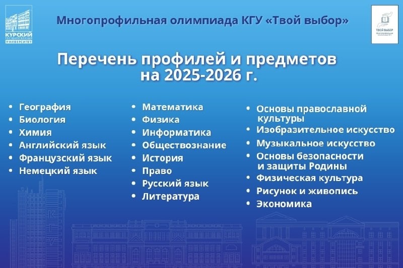 Многопрофильная олимпиада КГУ «Твой выбор» расширяет контингент участников👥 Это значит, что участвовать могут не только школьники 7-11 класса, студенты среднего профессионального образования (СПО) России, но и иностранные абитуриенты. Всё очень просто: ✓ выбирай предмет(ы) ✓ участвуй в Олимпиаде ✓ получай дополнительные баллы В этом году олимпиада «Твой выбор» вошла в приказ Министерства Просвещения РФ, а это значит, что участие, призёрство и победа в ней повышает шанс на получение индивидуальных достижений во многих вузах России. За всей дальнейшей информаций следи в социальных сетях: 🔵Вконтакте 🔵Официальный сайт Желаем успехов участникам🌟 ❤️ КГУ в MAX