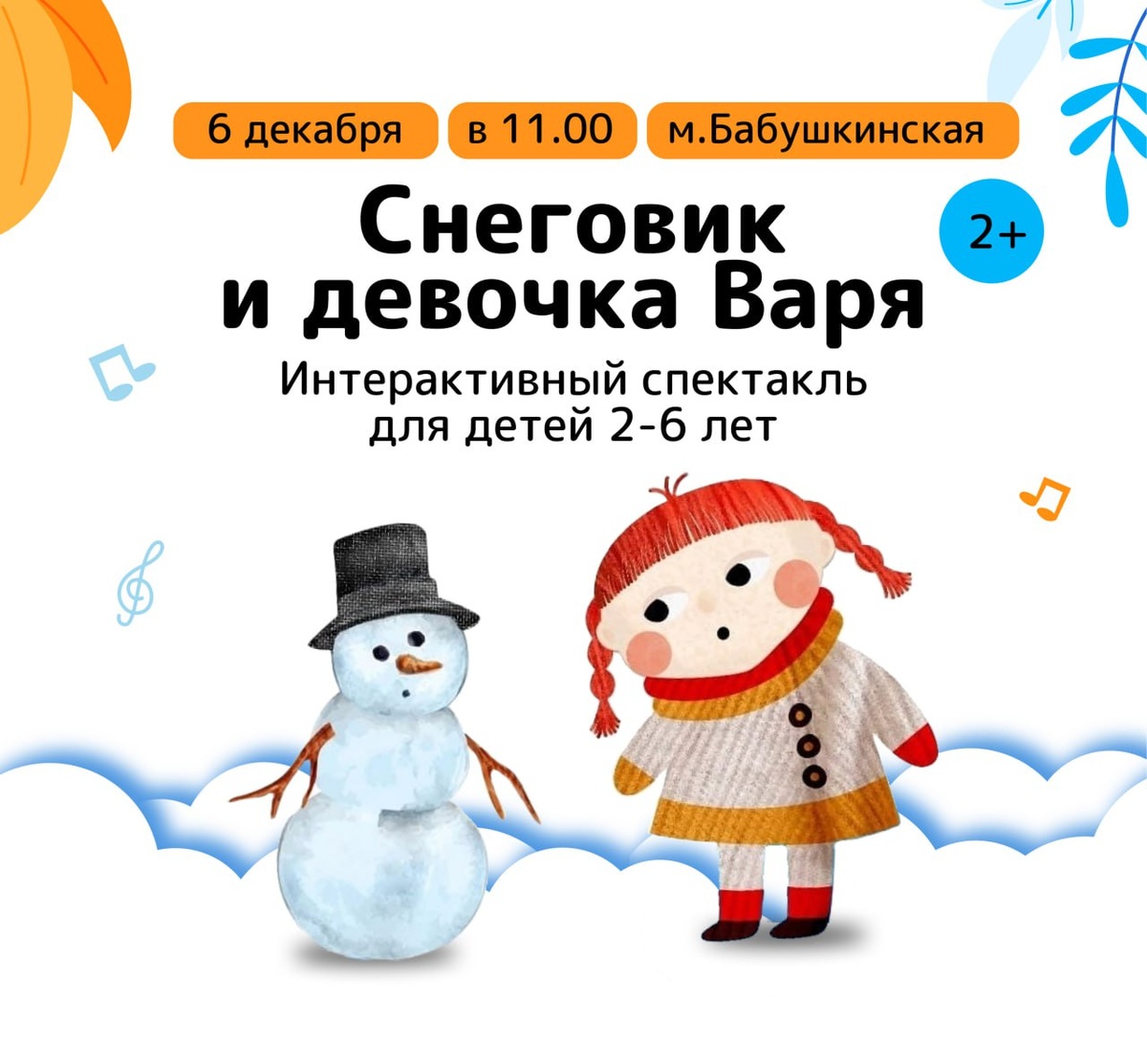 Встречаем декабрь новогодней программой! ✨🎄 В эту субботу приглашаем вас на невероятно трогательный и интерактивный спектакль от театра «4 угла» — «Снеговик и девочка Варя». Это история о самой настоящей дружбе, которая способна растопить даже зимний холод. Вместе с героями зрители будут играть в снежки, учиться мечтать и, конечно, понимать, что такое верность и поддержка. Каждый ребёнок сможет не просто смотреть, а стать частью этой волшебной сказки, помогая Варе и Снеговику на их пути! 📍 Ждём вас 6 декабря (суббота) в 11:00 📍 Для детей 2–6 лет 📍 Продолжительность: 35 минут 📍 Филиал «Учёный кот»: м. Бабушкинская, ул. Искры, 9к2 Стоимость билета: 🎫 1500 руб. — при покупке до 3 декабря 🎫 2000 руб. — 4–6 декабря 🎁 Один сопровождающий взрослый проходит бесплатно! ➡️ Забронировать место в сказке-купить билет ______________________________________ 🎄🎄🎄 А также в декабре мастер-классы, спектакли и елки. Больше анонсов — в разделе «Ближайшие события» на нашем сайте Пусть это