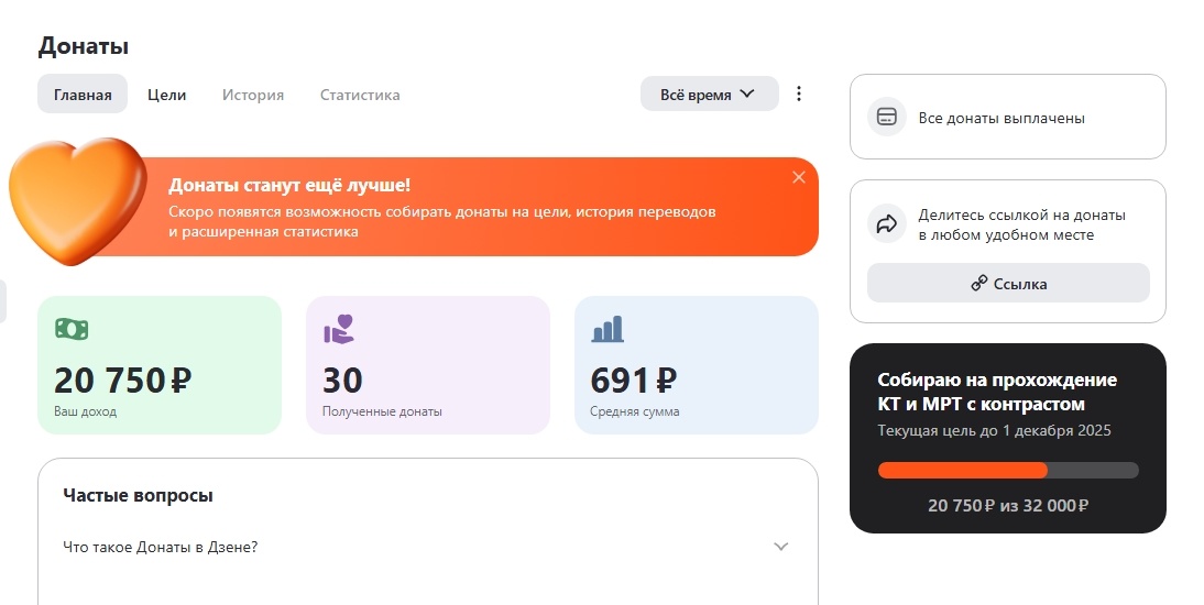 Это я про донаты. 30 человек помогли мне со сбором на необходимые обследования, и я бесконечно благодарна всем участникам! Сердечки - потому, что каждый из вас поддержал меня от чистого сердца, а еще, потому что у Дзена знак доната - это сердечко на ладошке. Сбор на КТ и МРТ был до 1 декабря. КТ я уже сделала, опубликовала отчет и результаты. На сегодняшний день, 1 декабря, сбор выглядит вот таким образом - на скрине. Сумма собранная - 20750 минус 10%, которые берет себе Дзен, итого - 18675 рублей. От 18675 отнимаем сумму, потраченную на КТ (14250) = 4425 рублей. Сегодня не записываюсь, так как после похорон я все же заболела, может вирус, может промерзла на ветру. Ну, главное, кажется, сегодня уже переломный момент на выздоровление. Надеюсь, через пару дней буду уже в строю. Прием онколога в ЦАОП у меня 22 декабря, я как раз успеваю все сделать - и МРТ, и повторный онкомаркер. Еще надо наконец-то забрать из поликлиники свое направление по 057 на "колону" и фгдс в экспертную клинику