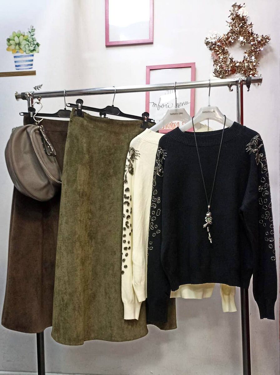 ❤️❤️❤️❤️❤️❤️❤️📌 ⏺️Джемпер, расшитый пайетками Черный и белый цвета в наличии 🤍 Состав вискоза/ микрофибра Размер единый 44-48 4.200₽ ⏺️Юбка микровельвет Шоколад и хаки цвета в наличии 🤍 Размер единый 46-50 4.800₽