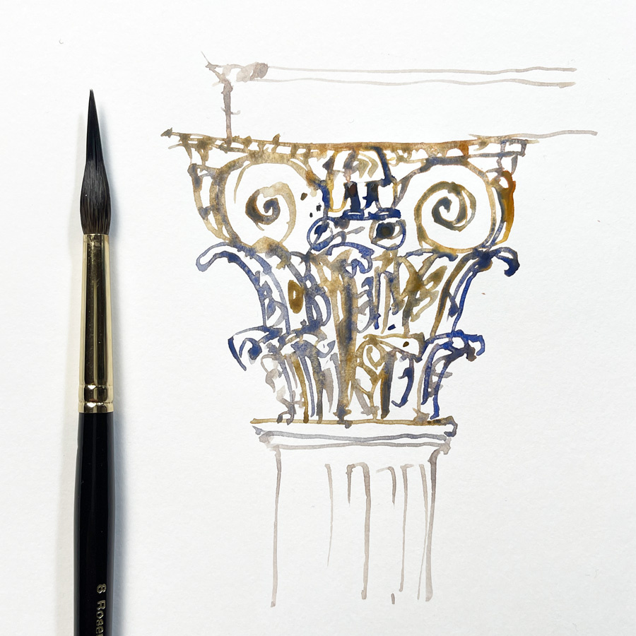 Если честно, я давно присматривалась к кисти с удлинённым остриём. А в этом месяце она неожиданно стала моей главной помощницей — особенно в 30×30-скетчах по барокко, которые я пишу акварелью напрямую, без линера. В начале месяца я заполнила целую страницу, сравнивая разные тонкие кисти. Такие творческие задачи замечательно подталкивают меня к экспериментам. Ещё в прошлом году, когда я работала над проектом “Lockdown Teacups”, я всё думала о тонких кистях — тогда тестировала множество миниатюрных вариантов из Rosemary Brushes. Но в этот раз мне захотелось попробовать что-то чуть крупнее. Сначала я взяла крошечный кинжал — маленькую dagger-кисть. Потом перешла к аккуратной круговой кисти №1. А затем, без особых раздумий, поняла, что именно кисть с удлинённым кончиком лежит в руке лучше всего. Это был не научный выбор — просто чистое ощущение. Эта кисть вообще не новинка. Это рождественское специздание 2016 года — я даже помню, в какой коробочке она приехала. Позже она снова появлялась