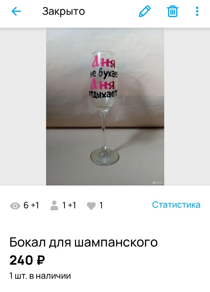 Вот сейчас то точно можно сказать что продажи декабря открыты. В предыдущей статье я писала, что один заказ едет, другой заказали сегодня. Но заказы, есть заказы. Они как есть, так их могут и отметить или отказаться. А вот самовывоз это "железно", что забрали. Вчера разместила объявление с бокалом для шампанского с надписью " Аня не бухает Аня отдыхает ". Заказывала на Авито в районе 150 рублей. Использовался пару раз. А потом так и стоял без дела. И вот сегодня девушка написала и через 20 минут забрала. Рассказала, что увидела объявление и скинула подруге, той понравилось так и случилась продажа, а у меня + 240 рублей.