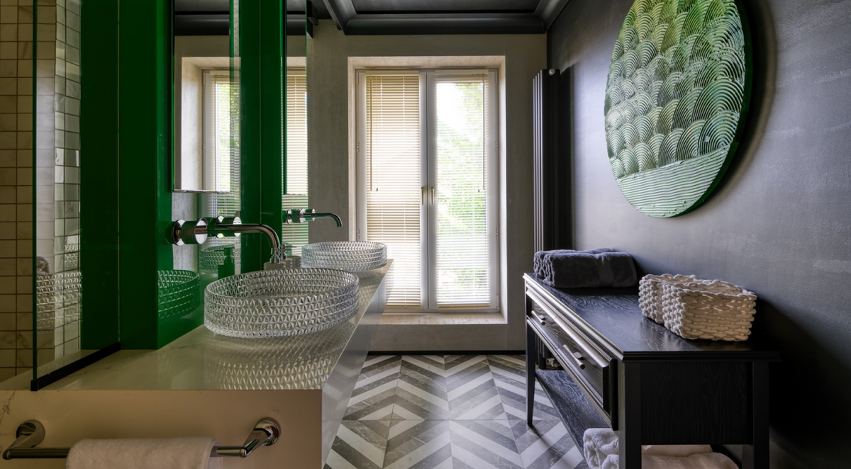 Отдельное внимание заслуживают две массивные конструкции: колонны цвета изумруда. Они скрывают в себе всю сантехническую систему, являются опорой для зеркал, держат смесители и выглядят как арт-объект.