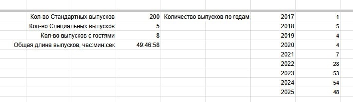 Аналитики пост В свежем выпуске подкаста за номером 200 раскрыл немножечко статистики за всё это время. Ну, что, если кто-то захочет переслушать все выпуски «Солар-Ньюс» (все 205), ему потребуется чуть более двух суток на это. Ну, это, если не слушать, как я, на ускорении. Так, вот. Добавляю статистику выпусков по годам (раз уж сказал, что выпуски выходят точно по расписанию). С середины 2022-го я решил, что надо бы выпускаться стабильно раз в неделю и пока что ТРИ ГОДА это получается делать. Горжусь немножко собой. И надеюсь, что это тоже кому-то приятно. Ну, а послушать последний выпуск по традиции можно: - на любимой подкастоплатформе, выбрав её на странице подкаста - тут, не выходя из тележеньки в mave.streame Ну, и для затравки, давайте накидаю, о чём там можно послушать: - Китай представил шикарный перовскитно-кремниевый тандем, на который я очень надеюсь - Африка и Финляндия говорят: «I have a dream», - и покупают солнечные панели - в Швейцарии появилась самая большая гармош