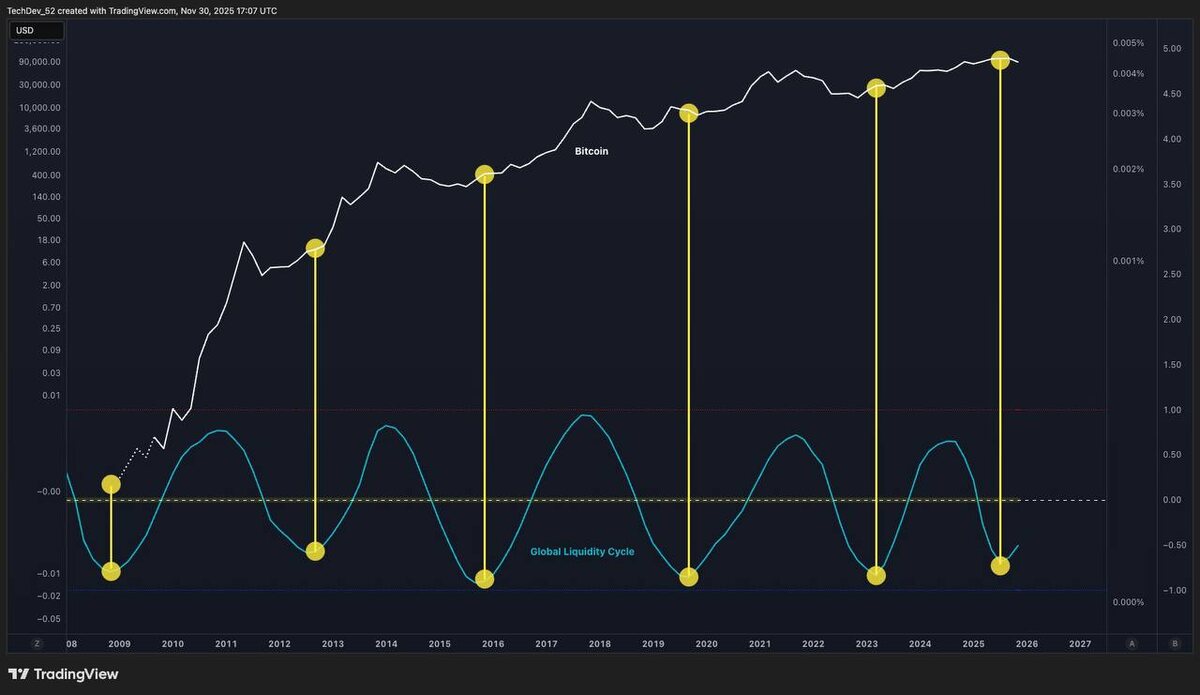 Когда «сигнал цикла» повторяется 5 раз подряд — а потом снова загорается. Что это значит? Есть такие графики, инвесторы, которые будто разговаривают с тобой. Молча. Без лишних слов. Просто показывают: смотри, всё уже было. И всё повторяется. Этот — один из них. Пять раз глобальный цикл ликвидности уходил на дно, и пять раз биткоин стартовал в очередной забег. Пять раз. Пять ритмов. Пять «вдохов» рынка. И вот — шестой. Загорелся. И на этом месте всегда звучит один и тот же вопрос: а вдруг в этот раз всё иначе? Инвесторы, я каждый раз ловлю себя на том, что на пике напряжения нам начинает казаться, будто история перестанет рифмоваться. Что вот сейчас — точно не так. Что условия другие, ставки другие, регуляторы другие, геополитика другая. Но график показывает неприятно простую вещь: ликвидность — это фундаментальный нерв глобальной системы. Когда она разворачивается вверх, деньги начинают искать риск. И биткоин, каким бы взрослым он ни становился, всё ещё самый чуткий инструмент на