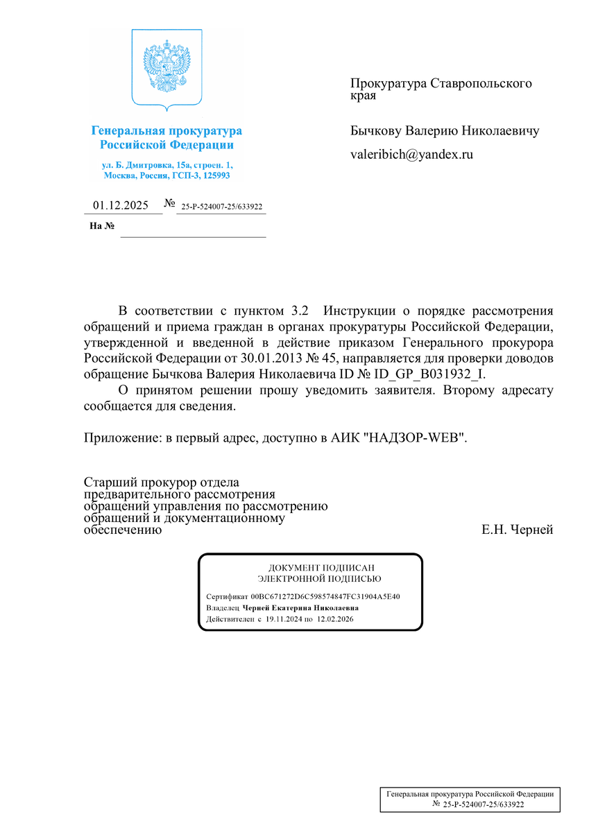 Читаем ответ от Роскомнадзора по СКФО от 2.12.2025 года. По их ответу, вопросами лжи в СМИ они не занимаются! Они не усмотрели признаков злоупотребления свободой массовой информации! Ложь допускается? Выходит, что свобода массовой информации, заключается в размещении всякой лжи и вранья! Великолепно! Нужен ли нам такой надзор? Опровергать свою ложь СМИ края не собираются? Ну ладно, если ложь от желтой прессы это одно, а когда исходит ложь от чиновника, мэра Кисловодска, это другое! Мы общественники не можем получить ответа ни от кого, какая цель вранья преследовалась?