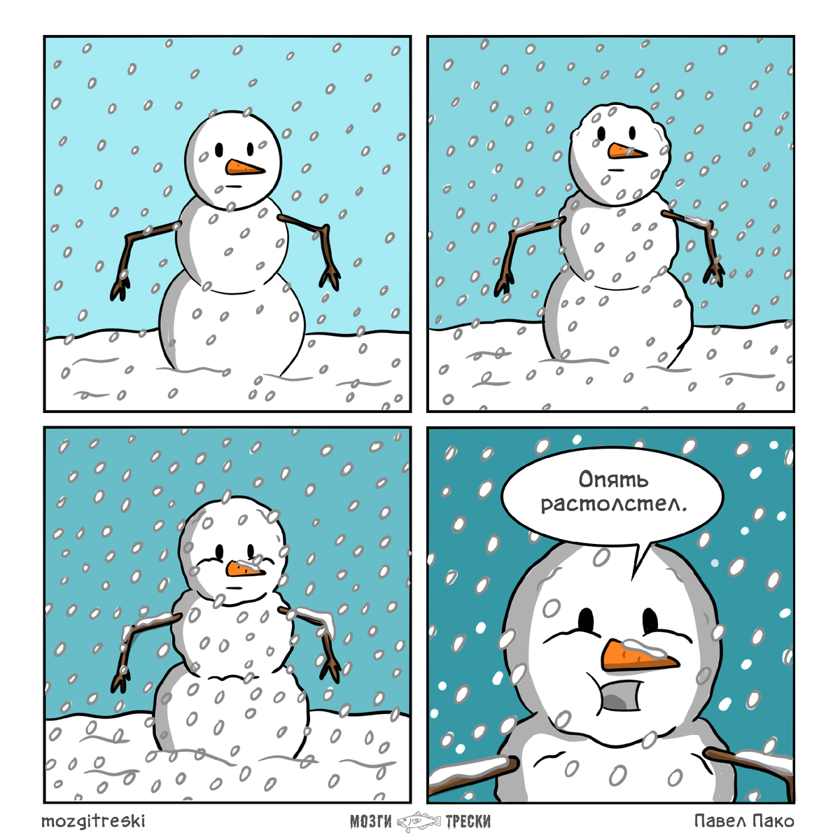 В последнее время у меня не получается выделять много времени на рисование комиксов из-за всяких разных сторонних проектов, но бросать это дело я все равно пока что не собираюсь и делиться своими работами в этом блоге, само собой, тоже продолжу. И сегодня у меня накопилась очередная пачка комиксов, которые я хочу вам показать. Надеюсь, что вам понравится! Как всегда для начала представлюсь: меня зовут Павел Пако и вот уже почти 10 лет я рисую комиксы. Моя старейшая серия комиксов называется Мозги трески - это такие короткие смешные комиксы на самые разные темы. Новые выпуски выходят по понедельникам в одноименной группе в VK (там же я выкладываю и все свои остальные работы), а также я веду свой Телеграм-канал. Ну а в этом канале я делаю подборки своих комиксов и немного рассказываю об их создании. К примеру, первый комикс в статье - это продолжение небольшой серии зарисовок о депрессивном снеговике, а также своеобразный ремейк самого популярного комикса о нем. Да, сейчас, конечно, уже