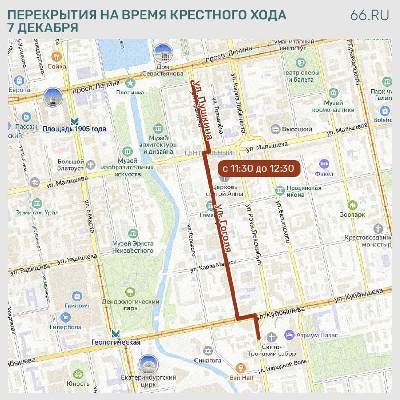Участники крестного хода в честь святой Екатерины пройдут от Свято-Троицкого кафедрального собора до площади Труда. Об этом сообщили в администрации города. До этого в Свято-Троицком соборе пройдет Божественная литургия, которую возглавит митрополит Верхотурский и Екатеринбургский Евгений. Накануне праздника он напомнил о значении святой для истории города. «Она владела 22 языками, обладала большим объемом знаний. Но главное — она сумела узнать Бога. Ее земная жизнь завершилась в 305 году — 1720 лет назад. Имена императоров забылись, а имя святой Екатерины сохранилось в названиях пятнадцати городов мира, в том числе нашего», — сказал он. На время православного шествия с 11:30 до 12:30 перекроют движение транспорта по улицам: В это время на маршруте будут дежурить полицейские.