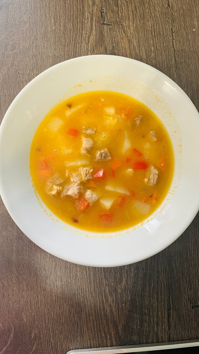 Варим мясо, готовое мясо нарезаем мелкими кусочками и возвращаем в бульон. Добавляем в бульон порезанную кубиком картошку и несколько столовых ложек чечевицы (если не любите разваренную чечевицу, то лучше добавить ее позже). Мелко режем лук, на крупной терке тоем морковь. Обжариваем на растительном масле, в конце добавляем мелко порезанный болгарский перец. Добавляем зажарку в суп. Солим. Варим до готовности.