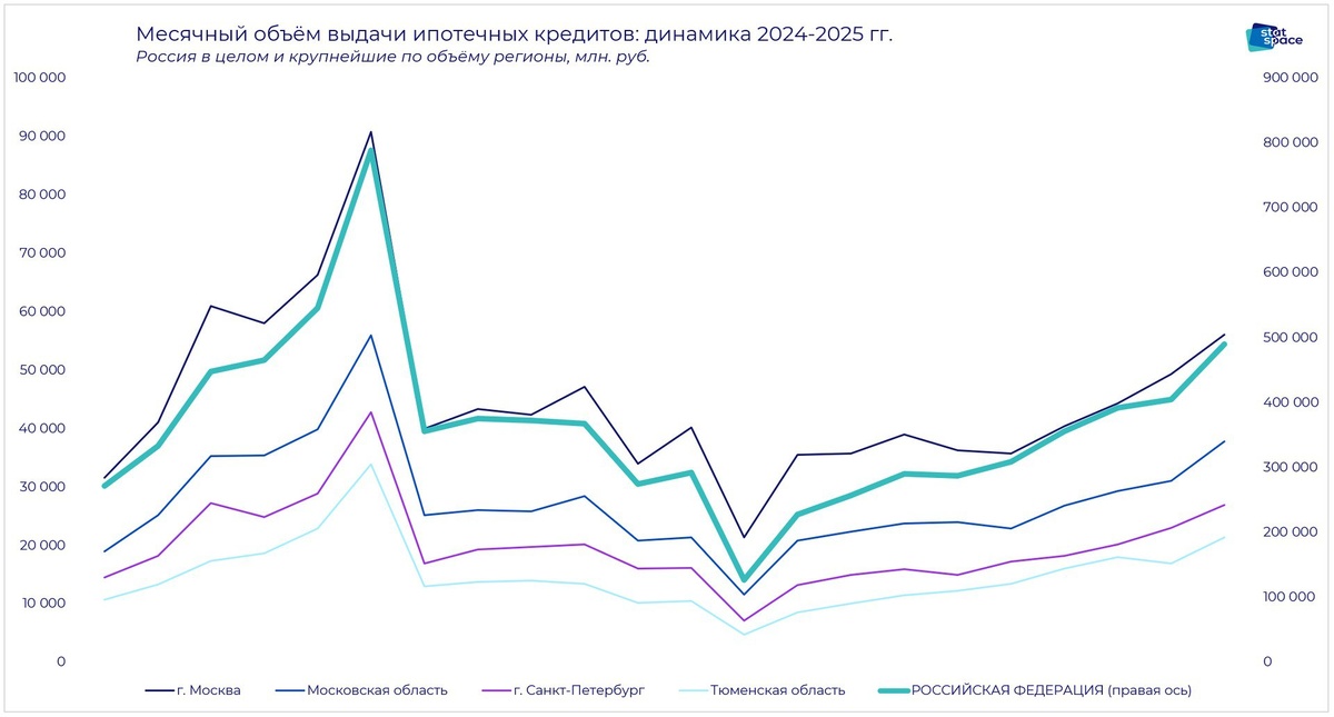 Ипотека: рынок потихоньку восстанавливается За октябрь 2025 в России было выдано ипотечных кредитов на 489.8 миллиардов рублей - рост на 33.4% по сравнению с октябрём прошлого года (367 миллиардов), но на фоне 770 миллиардов в октябре 2023 смотрится это всё равно достаточно бледно. Интересно, что темпы восстановления в Москве оказались ниже, чем в среднем по стране: +19% к прошлому октябрю и весьма ощутимые -40% к октябрю 2023 (против +33.4% к прошлому и -36.4% к 2023). А вот в Московской области цифры на уровне (и даже чуть-чуть лучше) средних по стране!