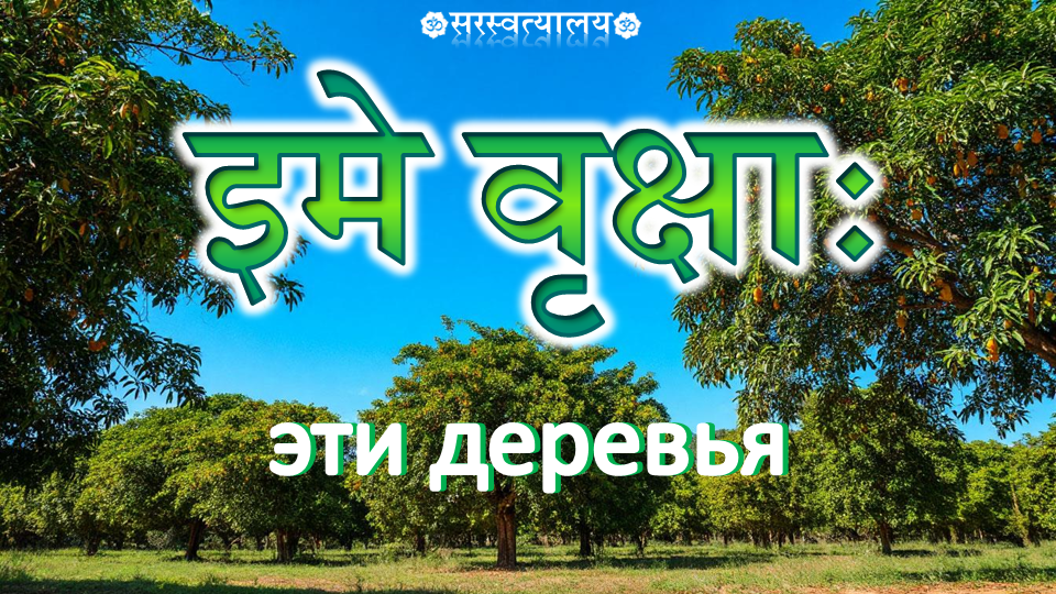 Местоимения अयम्, इमौ, इमे используются для указания на людей и объекты, обозначаемые существительными мужского рода, в зависимости от их числа. Род существительных в русском языке и санскрите не всегда совпадает. अयम् (единственное число) этот इमौ (двойственное число) эти два इमे (множественное число) эти Единственное число 1. अयं वृक्षः аям врыкШа(ха) это дерево 2. अयं कविः аям кави(хи) этот поэт 3. अयं भानुः аям б(х)Ану(ху) это солнце Двойственное число 1. इमौ वृक्षौ имау врыкШау эти два дерева 2. इमौ कवी имау кавИ эти два поэта 3. इमौ भानू имау б(х)АнУ эти два солнца Множественное число 1. इमे वृक्षाः име врыкША(ха) эти деревья 2. इमे कवयः име кавая(ха) эти поэты 3. इमे भानवः име б(х)Анава(ха) эти солнца Курсы санскрита для начинающих Письменность и произношение Существительные трёх родов Двойственное и множественное число Глаголы и предложения