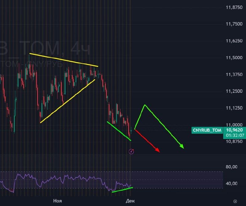 🔤 Юань-Рубль 🟢 Сегодня в утреннем видео предположил, что возможен отскок. Пока он идет. После треугольника у нас случился выход вниз. Сейчас нарисовали конвергенцию. В случае ее отработки вернемся к уровню 11,1380, но потом все равно буду ждать вниз. Если же конвергенция сломается на геополитическом позитиве, то пойдем по красной стрелочке ниже 10,84. 🟢 Не забываем, что 19 декабря будет решение ЦБ по ставке. Возможен спекулятивный разгон валюты под это событие, но пока еще рановато, поэтому этот маршрут не рисую. 🚗 В целом жду сильный рост акций и сильное укрепление рубля, потом обратные процессы. #юаньрубль #прогнозрубля #юань #рубльдоллар #CNY #CNYRUBF #CNYRUB #bogdanoffinvest