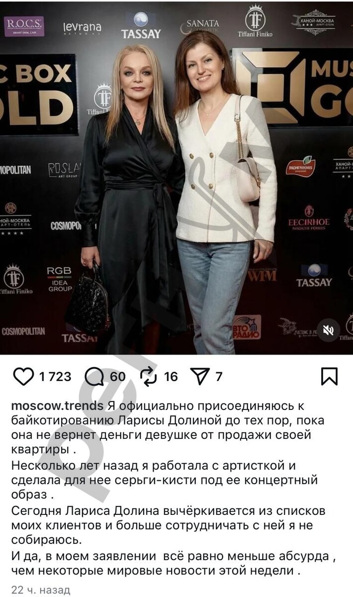 Уже несколько дней в Сети нарастает массовое народное негодование, связанное в решением Кассационного суда и действиями народной артистки РФ Ларисы Долиной. "Эффект Долиной" уже давно перебрался со страницы в сетевой энциклопедии в жизнь каждого жителя нашей необъятной Родины. Сотни постов от мелких, средних и крупных предприятий, предпринимателей и иже с ними, в которых владельцы бизнеса отказываются обслуживать у себя народную артистку заполонили соцсети. Даже неутомимая Ксения Собчак вместе с супругом - режиссером Константином Богомоловым выложили осуждающий "эффект Долиной" ролик. Про откровенную несправедливость ситуации с квартирой Долиной высказались уже и автор "Беспринципных" Александр Цыпкин, потребовавший у Верховного суда пересмотра дела, и экс-солистка "Миража" Светлана Разина, и Катя Гордон, и Никита Джигурда и еще многие и многие известные и не очень люди. Стилисты, организаторы концертов и дизайнеры делятся своими негативными воспоминаниями о работе с создающей погоду (