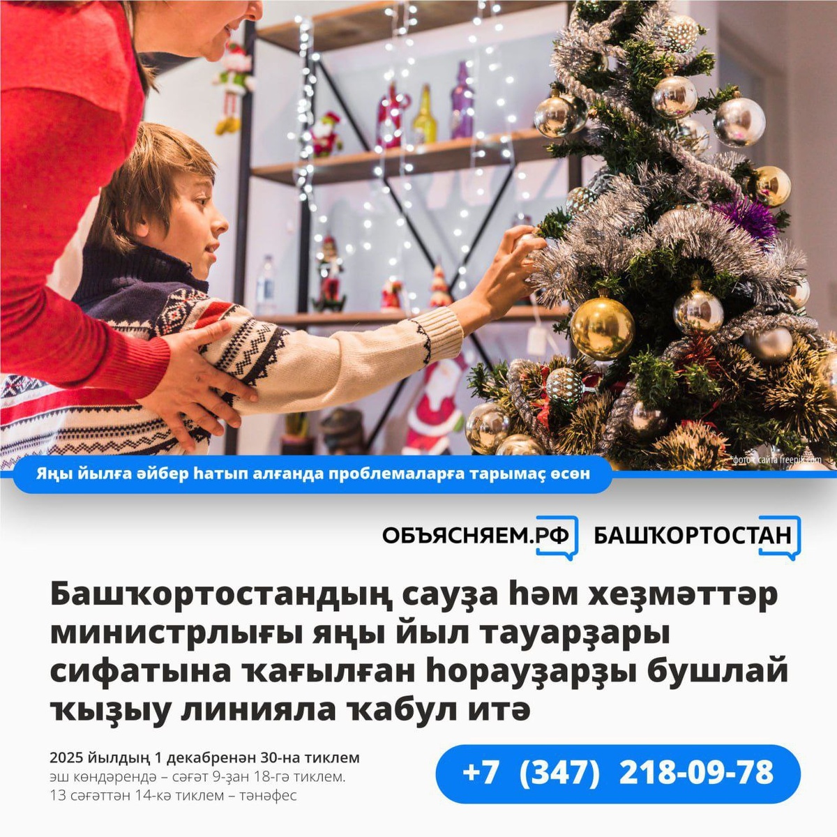2025 йылдың 1 декабренән 30-на тиклем республикала йәшәүселәр яңы йыл тауарҙары һәм хеҙмәттәренә ҡағылған һорауҙары буйынса Башҡортостандың сауҙа һәм хеҙмәттәр министрлығы белгестәренән бушлай белешмә алырға мөмкин. Кәрәк булһа, дәғүә яҙырға ярҙам итәсәктәр. Ҡайҙа мөрәжәғәт итергә? Ҡыҙыу линияға шылтыратығыҙ: +7 (347) 218‑09‑78 (эш көндәрендә — сәғәт 9-ҙан 18-гә тиклем, тәнәфес — 13 сәғәттән 14-кә тиклем) йәки шәхсән килегеҙ: Өфө ҡалаһы, Цюрупа урамы, 13-сө йорт, 703-сө бүлмә (эш көндәрендә — сәғәт 9-ҙан 17-гә тиклем, тәнәфес — сәғәт 13-тән 14-кә тиклем) Әйткәндәй, Сауҙа һәм хеҙмәттәр министрлығы сайтында һәм ҡулланыусылар хоҡуҡтарын яҡлау буйынса порталда дәғүә ғаризаларының әҙер өлгөләрен бушлай күсереп алырға мөмкин #Аңлатабыҙ_Башҡортостан