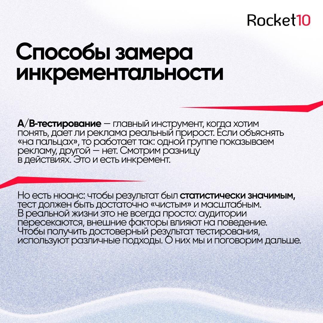 Инкрементальность: как измерить реальную ценность рекламы и не потратить бюджет впустую 🔥 Инкрементальность — это оценка реального вклада маркетинговых усилий в ваш бизнес-результат. Она помогает ответить на вопрос: «Какие действия пользователи совершили именно благодаря рекламе, а какие случились бы и без неё, то есть являются органикой?» 👀 Без тестов на инкрементальность нельзя принимать взвешенные решения по медиасплиту и масштабированию кампаний. Однако правильные замеры требуют времени, бюджета и идеальных условий. В карточках агентство мобильного маркетинга Rocket10 раскрывает гибкие методы, которые помогут измерять реальную ценность трафика с минимальными потерями и собирать максимум статистически значимых данных 🔝 Хотите больше полезной информации? На канале Rocket10 есть множество интересных материалов: 🚀 Инструменты аналитики, которые облегчат жизнь перформанс-специалистам. 🚀 Как создать креатив, который захватит внимание зумеров и превратит их в лояльных клиентов.
