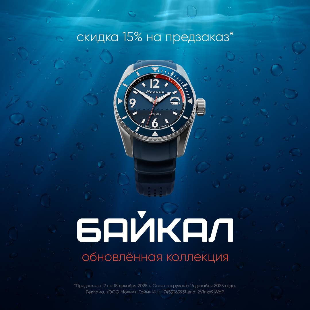 Часовой завод «Молния» с гордостью представляет обновленную коллекцию мужских наручных часов «Байкал», созданных для тех, кто стремится к приключениям и покорению морских глубин. Эти часы — воплощение надежности, функциональности и эстетики, которые оценят как дайверы, так и любители активного образа жизни. Надежность, проверенная временем В основе каждой модели лежит японский механизм Miyota 8215 с автоподзаводом и стоп-секундой, известный своей точностью и долговечностью. Водозащита до 200 метров позволяет использовать часы в самых экстремальных условиях, будь то погружение в морские глубины или активный отдых на воде. Круглый корпус диаметром 42 мм выполнен из высококачественной нержавеющей стали 316L, которая обеспечивает устойчивость к давлению и механическим повреждениям. Функциональность, продуманная до мелочей Модели коллекции «Байкал» оснащены завинчивающейся заводной головкой и однонаправленным керамическим безелем с крупными маркерами. Зубчатая насечка на внешнем крае