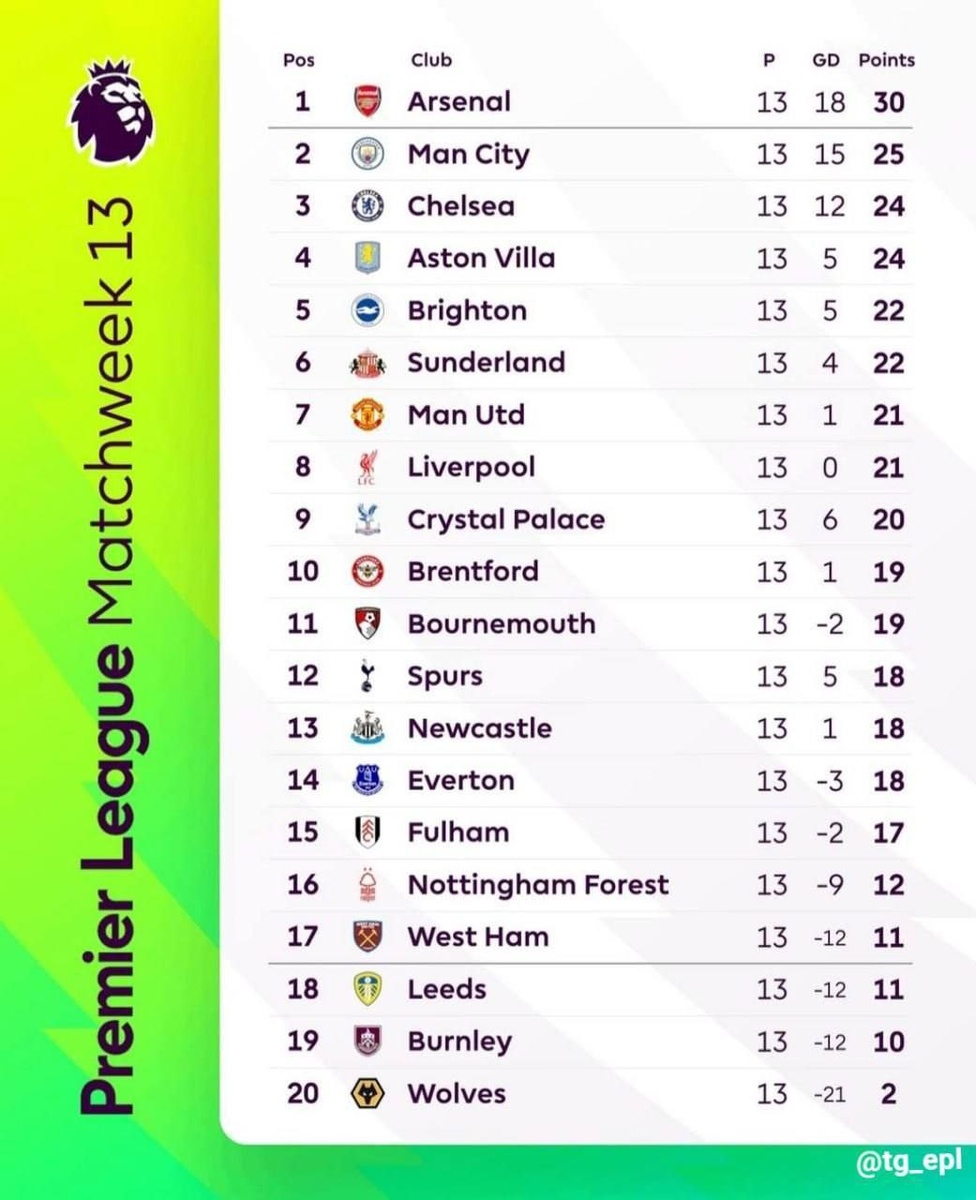 Турнирная таблица АПЛ после 13 тура