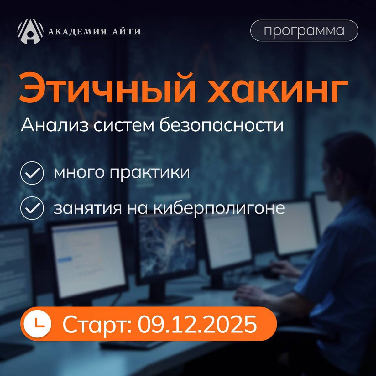 Пентестер: учитесь думать, как хакер Старт — 9 декабря 2025 В отчётах российских ИБ-компаний за три квартала 2025 года отмечается тренд: сложные атаки растут, а формальные проверки уже не закрывают все риски. Бизнесу нужны специалисты, которые находят уязвимости раньше злоумышленников. Пентест — это метод оценки безопасности систем. Он позволяет выявлять уязвимости, которыми потенциально могут воспользоваться атакующие. Пентестер — это специалист по кибербезопасности, который моделирует хакерские атаки, проводит аудит безопасности компьютерных систем и сетей, ищет слабые места. Его задача — пройти уязвимые точки, получить доступ к закрытой информации в рамках проверки, проанализировать каждый смоделированный шаг «злоумышленника» и минимизировать риски реального взлома. Представляем курс «Пентестер» от Академии АйТи — научим этичному хакингу. Мы предлагаем практику на реальных стендах под руководством экспертов. Что вы освоите за 2 месяца: ✅ Поиск и эксплуатация уязвимостей (SQLi,