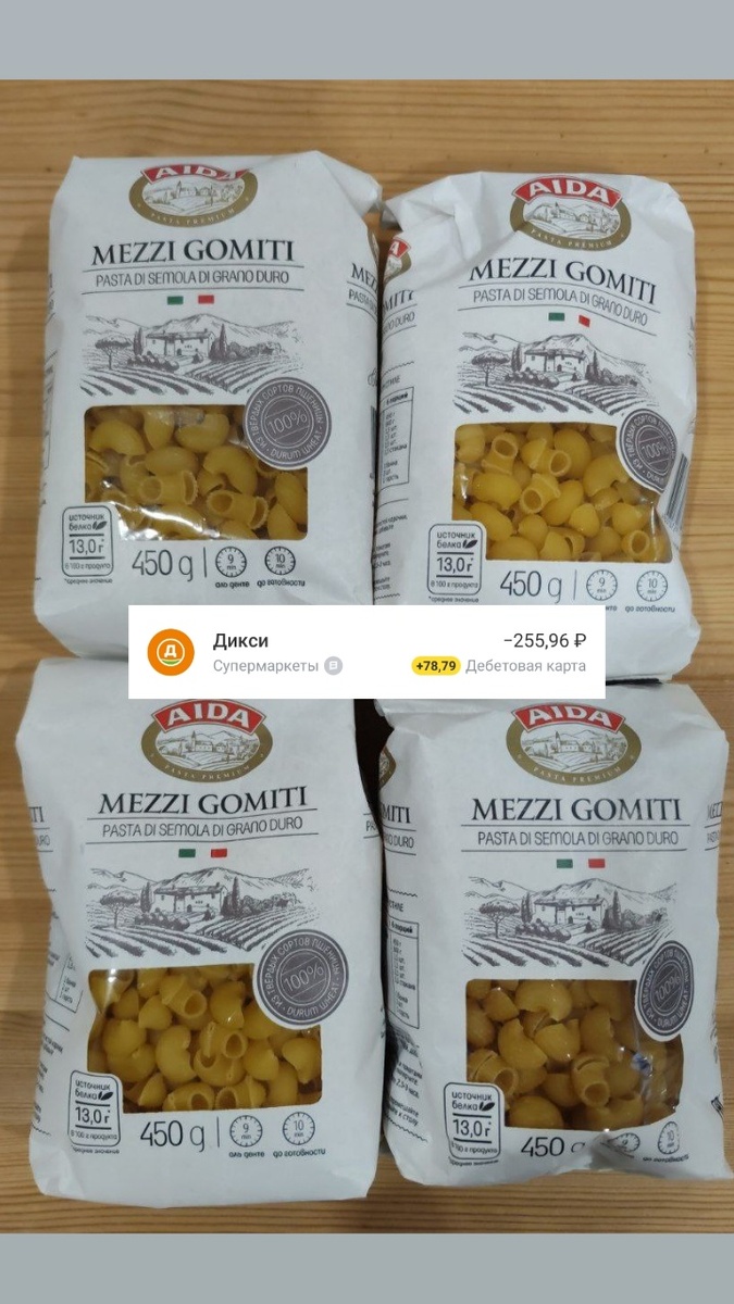 1. В Т-банке увидела 30% кэшбэка на макароны Аида. Мы их уже пробовали по вкусной цене от этого же банка ранее в этом году, плюс уже купленные по хорошей цене макаронные изделия были съедены, так что, решила я, пора пополнять запасы. Т к много я не могу нести из этого магазина - он находится далеко от дома, а носить тяжести я не люблю, то взяла только 4 шт. Выбрала любимым продуктом в Дикси и тут была на них акция - 2 пачки берешь и они по цене 69,99 р получались. После возвращения кэшбэка 1 пачка хороших макарон получилась по 44,31 руб.