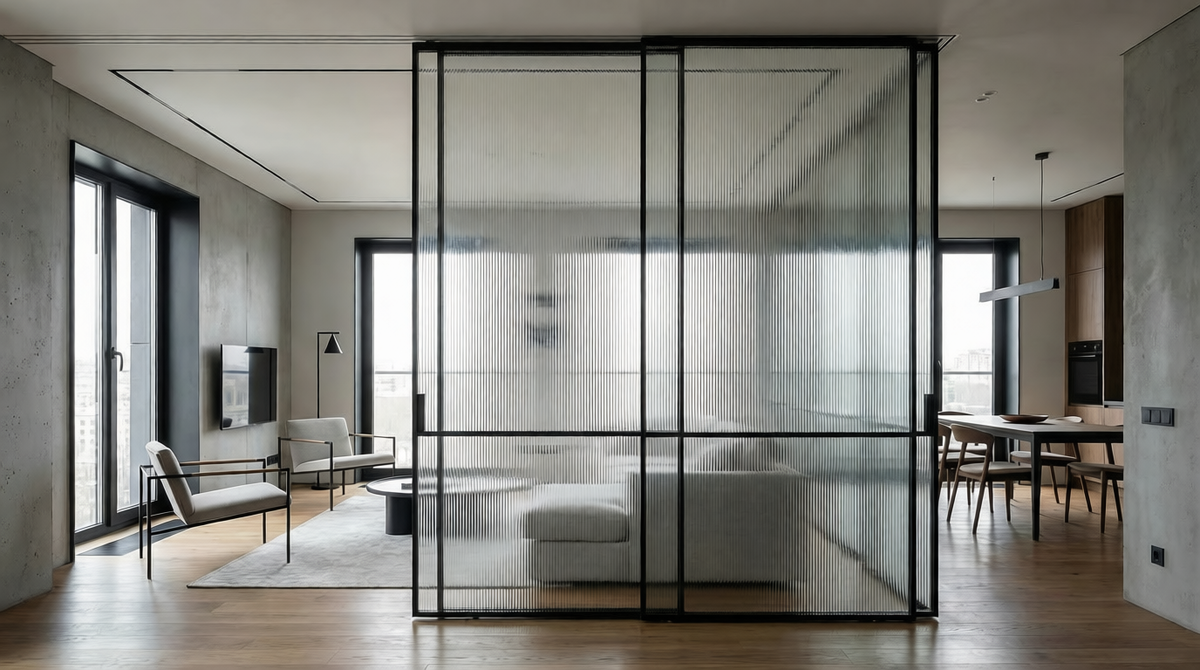 Как стекло стало неотъемлемой частью современного интерьера — и что нового нас ждет в ближайшем будущем. Прозрачность — это не просто красиво Еще 10 лет назад стеклянные перегородки казались чем-то из офисов крупных компаний или дорогих пентхаусов. Сегодня они — нормальная часть жизни: в домах, квартирах, шоурумах и кофейнях. Они делают пространство легким, пропускают свет, визуально расширяют комнату и не утяжеляют интерьер. А в 2026 году они становятся еще умнее и интереснее. Давайте разберёмся, какие стеклянные перегородки будут в моде в ближайшем сезоне, и почему за ними будущее. Рифленое стекло: приватность с изюминкой Гладкое прозрачное стекло — это классика. Но рифленое (или, как его ещё называют, фактурное) возвращается в тренды. И не просто ради эстетики. Рифленое стекло отлично пропускает свет, но при этом делает контуры расплывчатыми. Идеально для зонирования: вы вроде бы не закрываетесь, но ощущение уединения всё же есть. Особенно актуально для санузлов, гардеробных, домашн
